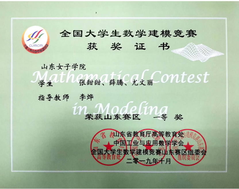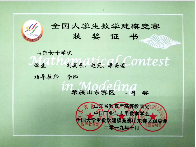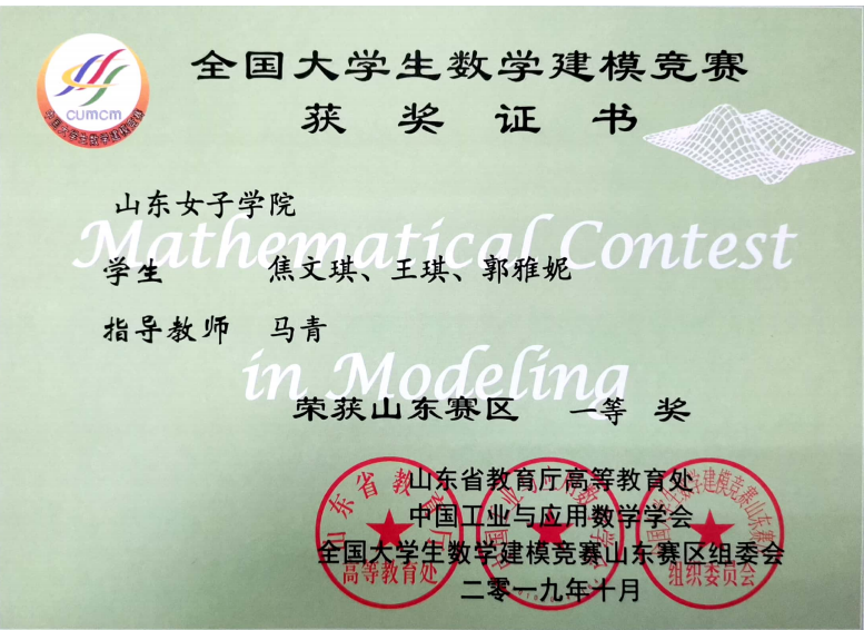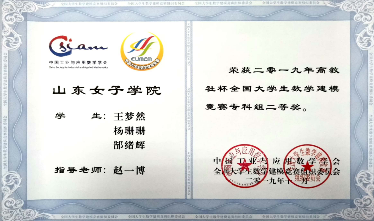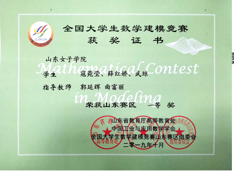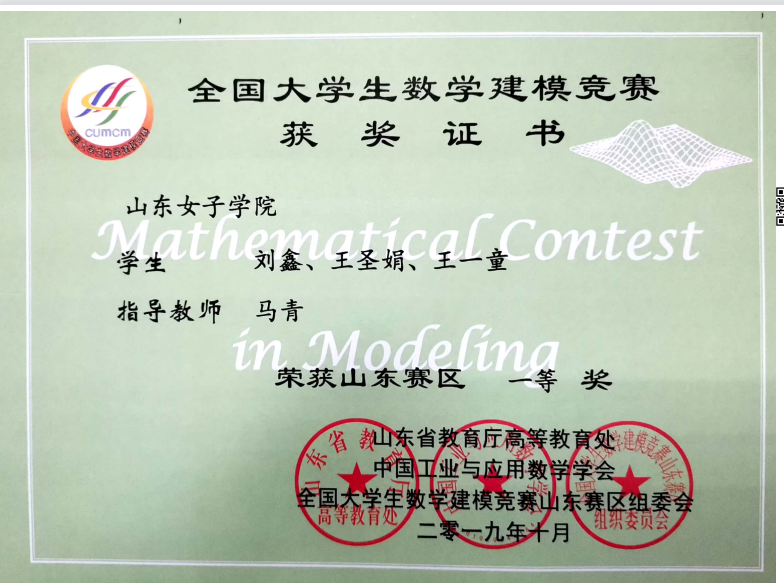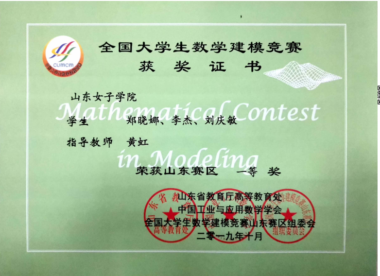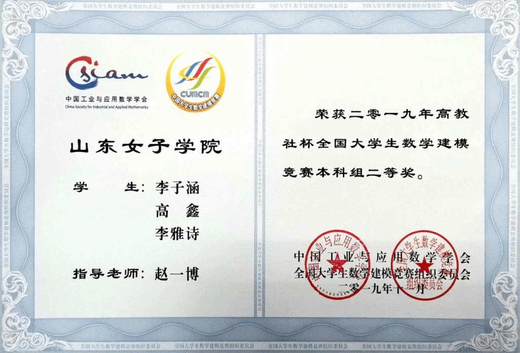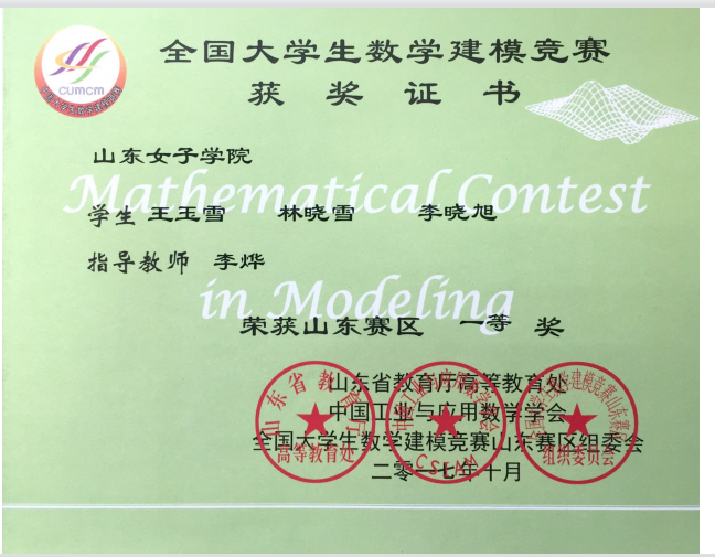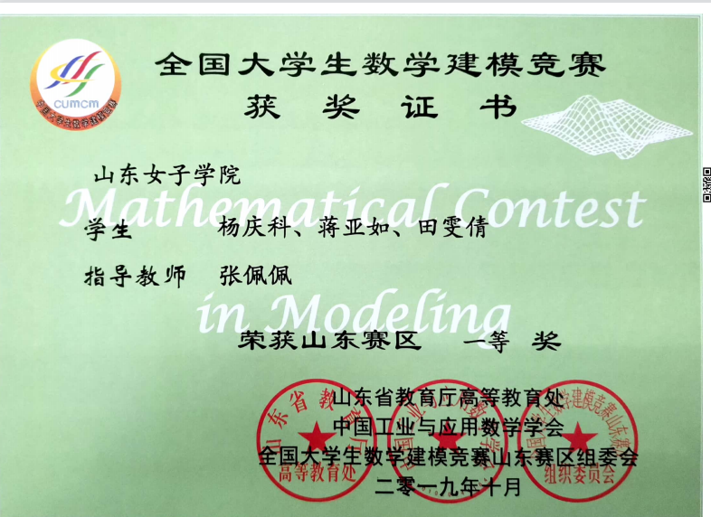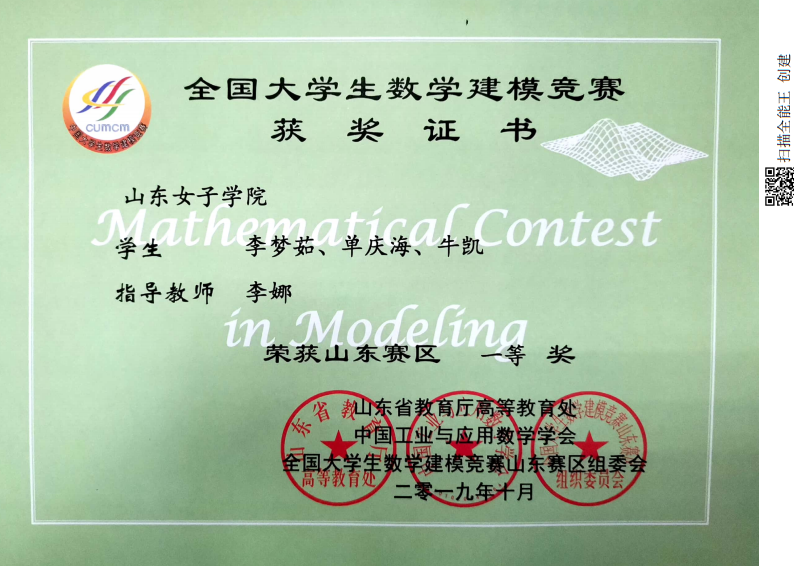 2019.10 李梦茹 “高教社杯”全国大学生数学建模竞赛 省级一等奖