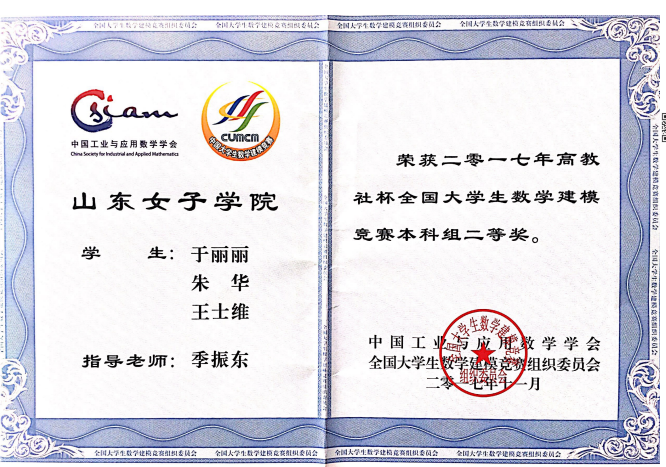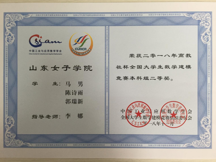 2017.11 于丽丽 “高教社杯”全国大学生数学建模竞赛 国家二等奖