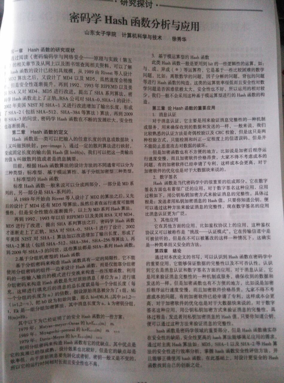 2016.04 徐秀华 密码学Hash函数分析与应用 教师