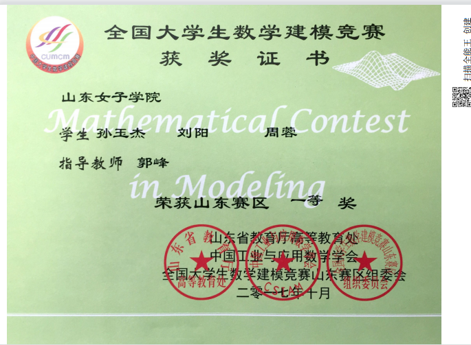 2017.10 孙玉杰 “高教社杯”全国大学生数学建模竞赛 省级一等奖