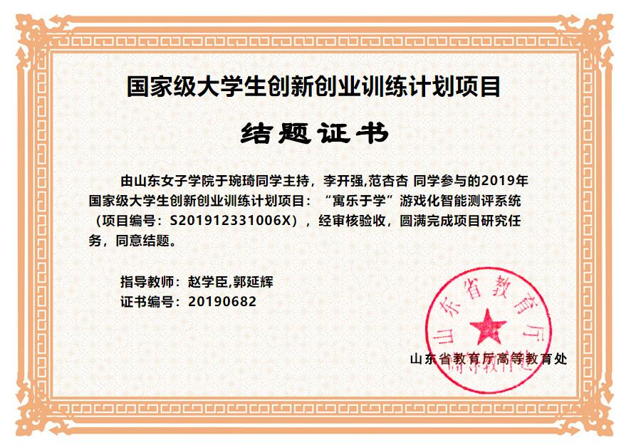 2019.07 于琬琦 "寓乐于学"游戏化智能测评系统 创业训练项目 省级