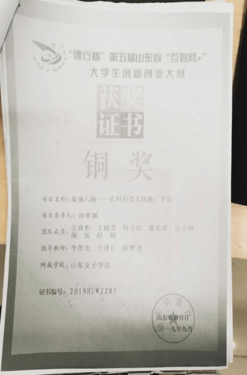 2019.08 商维娜 《最强六脑》 “互联网+”全国大学生创新创业大赛 省级三等奖