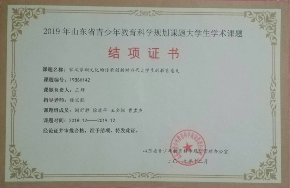 2019.02 王妍 家风家训文化的传承创新对当代大学生的教育意义 山东省青少年教育科学规划课题大学生学术课题 省级