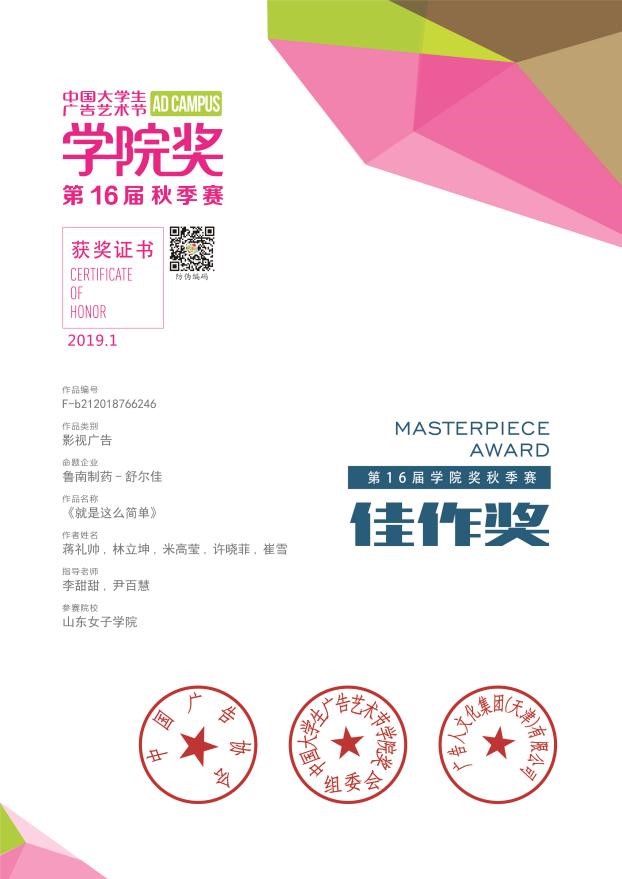 2019.01 蒋礼帅 中国大学生广告艺术节学院奖佳作奖 国家级