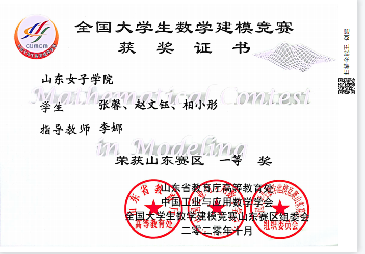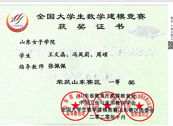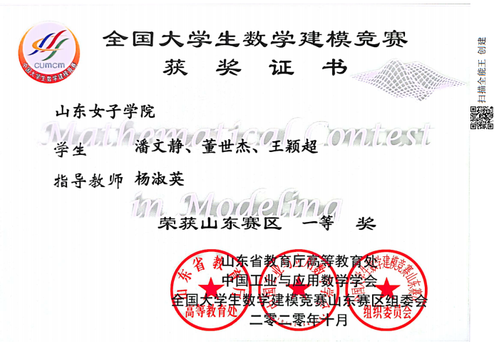 2020.10 王文晶 “高教社杯”全国大学生数学建模竞赛 省级一等奖