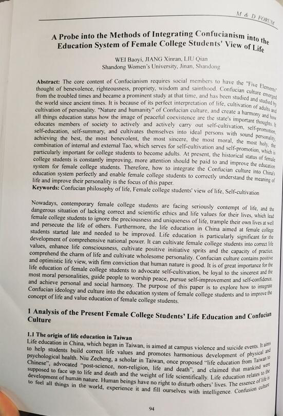 Confucianism into the Education System ofFemale College Students' View of Life》 《Proceedings of 2019 International Symposium--Outstanding Traditional Culture andQuality Education for Teenagers》