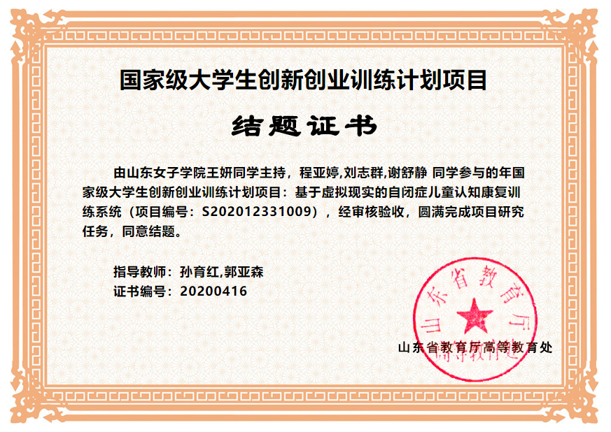 2020.12 王妍 基于虚拟现实的自闭症儿童认知康复训练系统 创新训练项目 省级