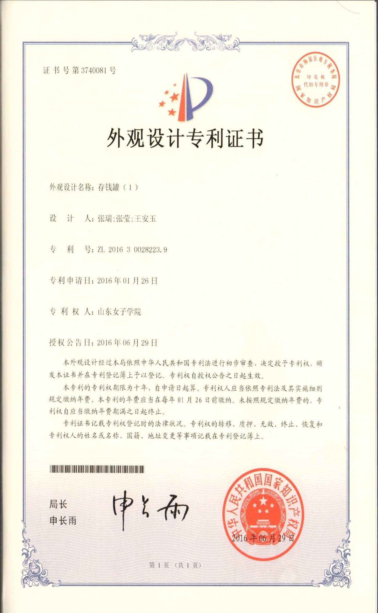 2016.06 张瑞 存钱罐(1) 外观设计专利
