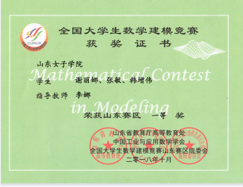 2018.10 谢丽娜 “高教社杯”全国大学生数学建模竞赛 省级一等奖