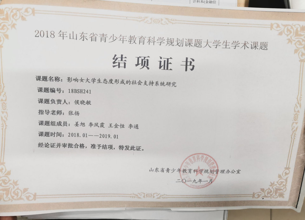2019.01 侯晓敏 影响女大学生态度形成的社会支持系统研究 青少年教育科学规划课题大学生学术课题 省级