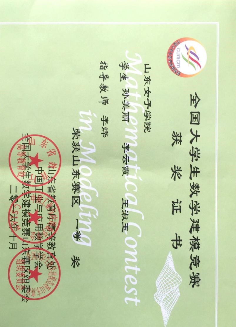 2016.10 孙洁 “高教社杯”全国大学生数学建模竞赛 省级一等奖