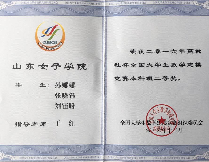 2016.11 刘钰盼 “高教社杯”全国大学生数学建模竞赛 国家二等奖