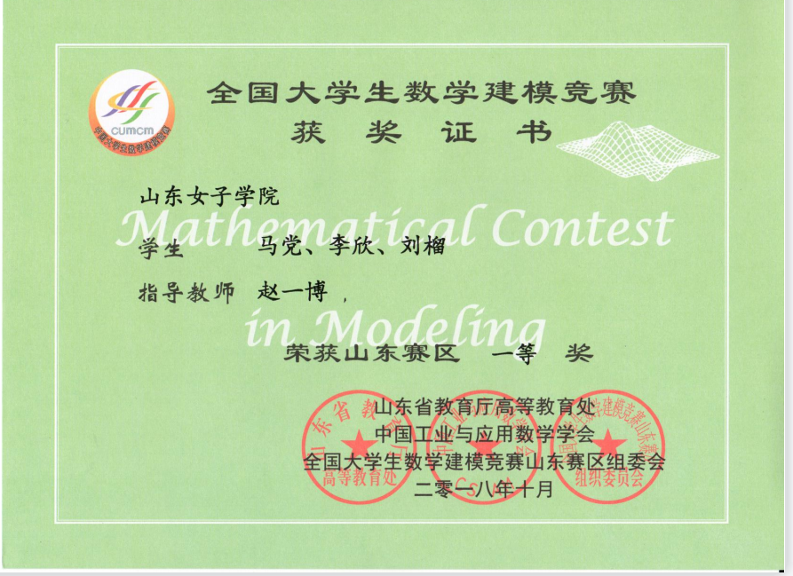 2018.10 赵庆辉 “高教社杯”全国大学生数学建模竞赛 省级一等奖