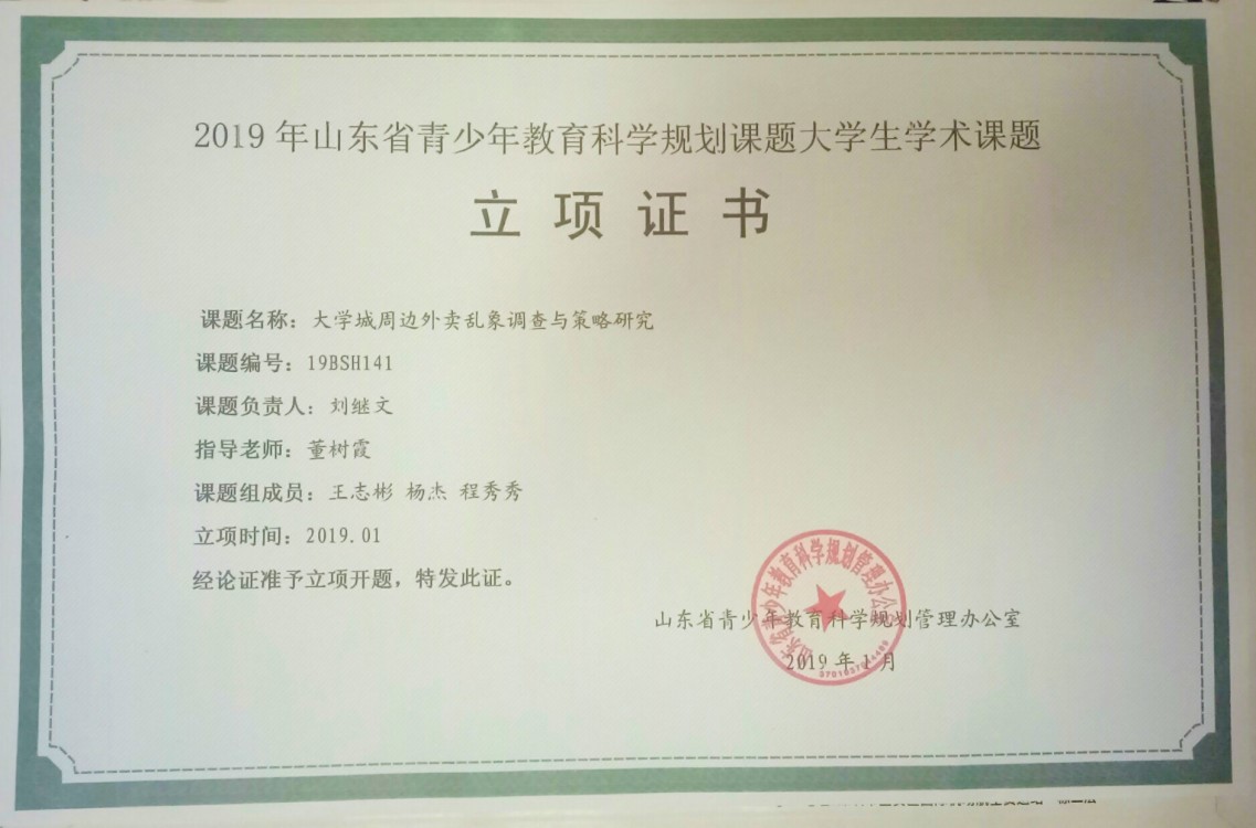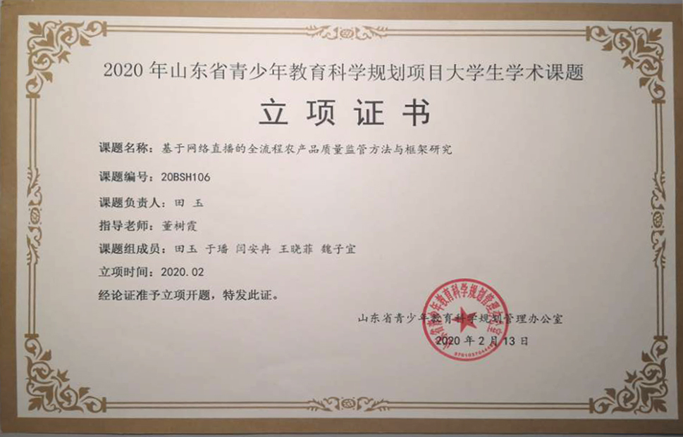 2020.02 田玉 基于网络直播的全流程农产品质量监管方法与框架研究 山东省青少年教育科学规划课题大学生学术课题 省级
