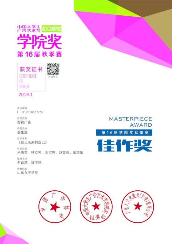 2019.01 米高莹 中国大学生广告艺术节学院奖佳作奖 国家级