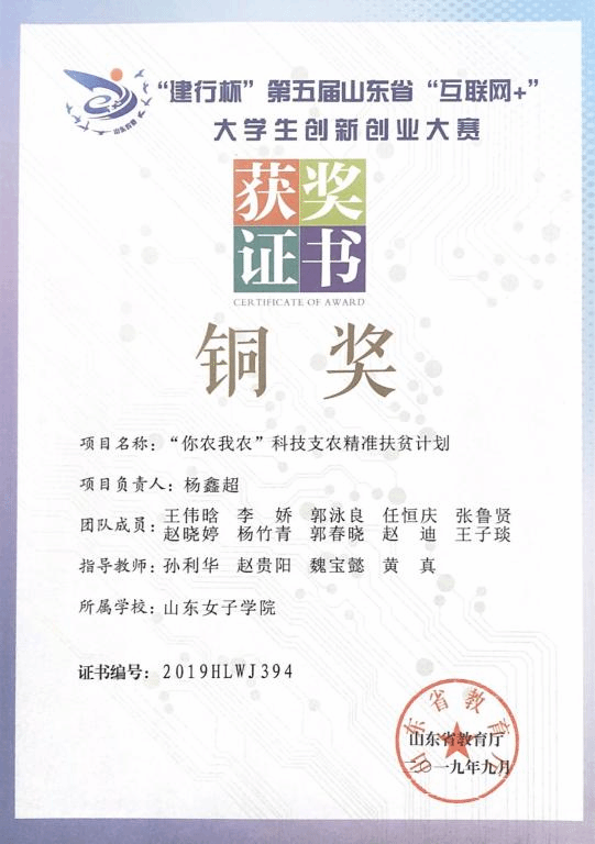 2019.08 杨鑫超 “你农我农”科技支农精准扶贫计划 “互联网+”全国大学生创新创业大赛 省级三等奖