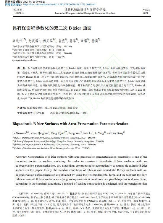 2021.10 赵庆辉 具有保面积参数化的双二次Bézier曲面 计算机辅助设计与图形学学报