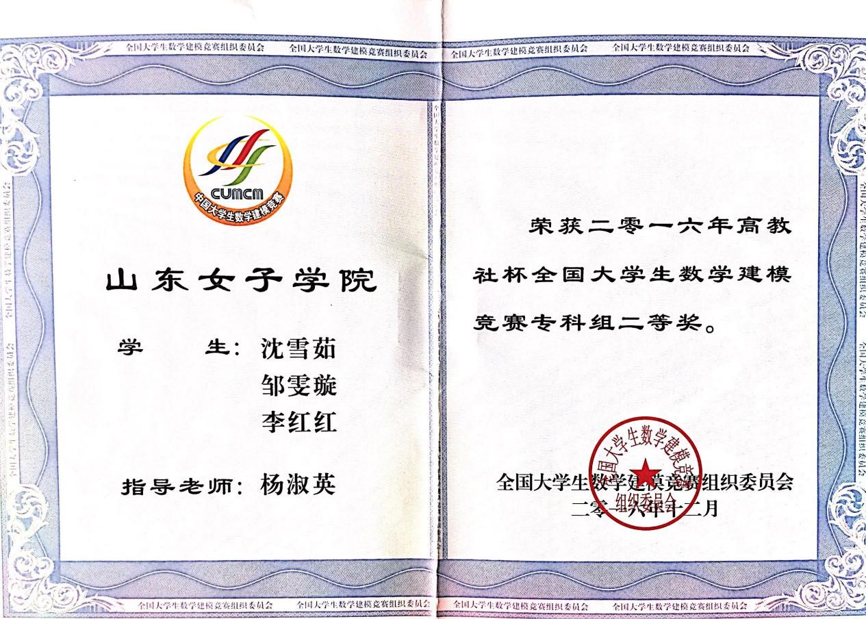 2016.11 邹雯璇“高教社杯”全国大学生数学建模竞赛 国家二等奖
