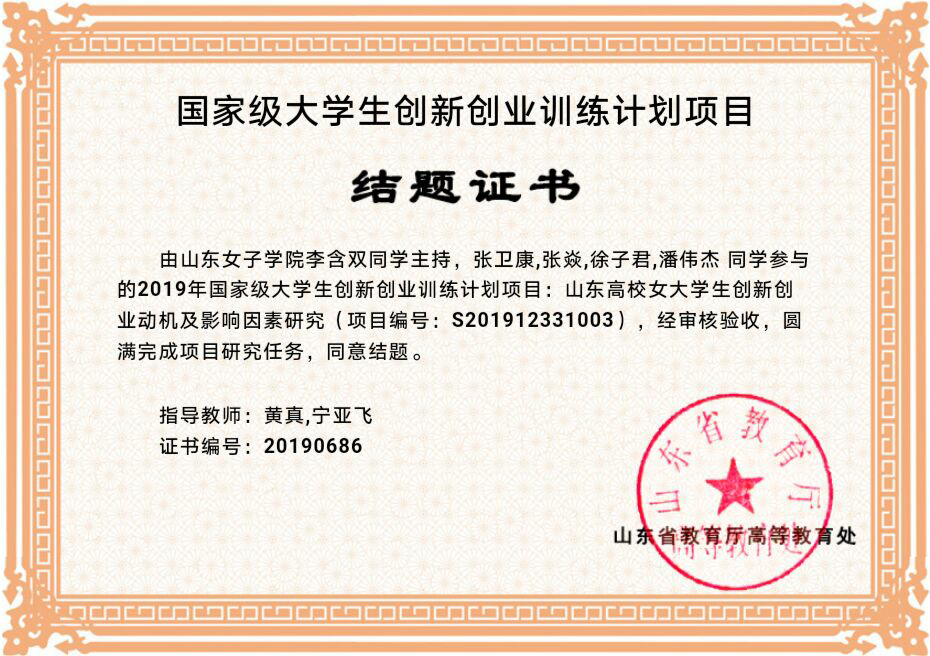 2019.07 李含双 山东高校女大学生创新创业动机及影响因素研究 创新训练项目 省级