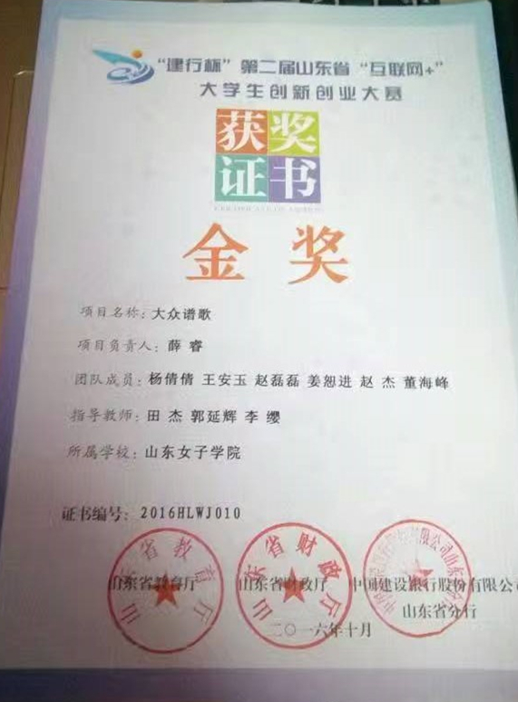 2016.08 薛睿 大众谱歌 “互联网+”全国大学生创新创业大赛 国家三等奖