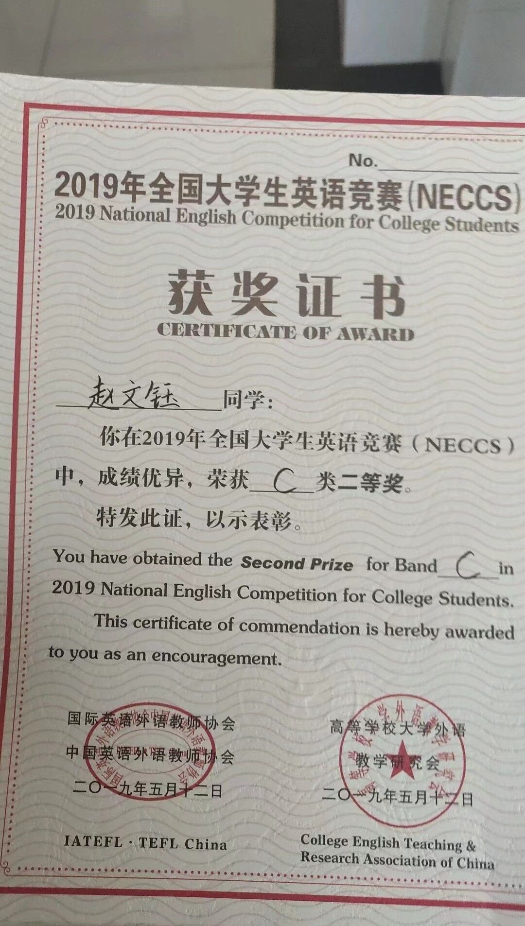 2019.05 赵文钰 全国大学生英语竞赛 国家二等奖