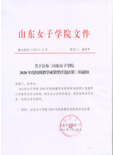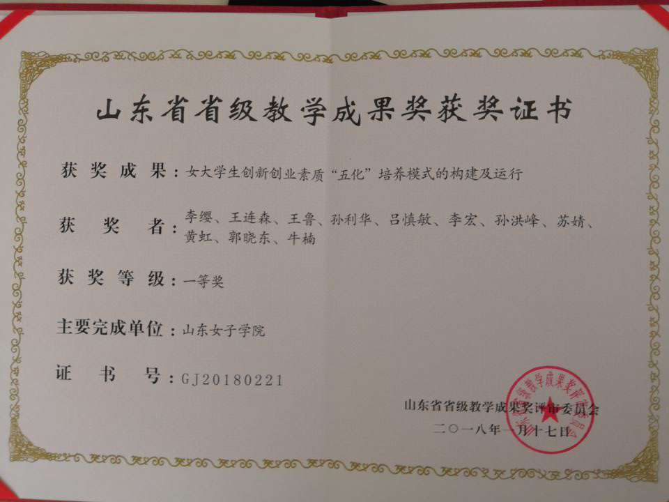1、省级教学成果奖:女大学生创新创业素质“五化”培养模式的构建及运行