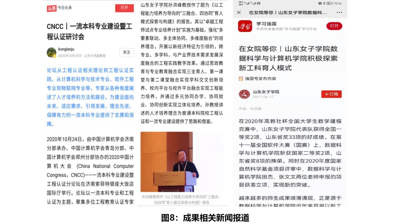 2020年10月在中国计算机大会分论坛上做《以工程能力为导向的“三融合、四协同”育人模式探索与构建》经验分享,引起广泛关注。该模式在山东计算机学会院长论坛上做典型发言得到兄弟院校好评,《山东女子学院数据科学与计算机学院积极探索新工科育人模式》在学习强国、中国教育在线、教信通、搜狐、头条、百家号等媒体被大量关注和转载,点击量超过百万。2018 年,我校入选教育部“全国应用型人才培养示范基地”,2020年获批山东省产教融合骨干带头人。